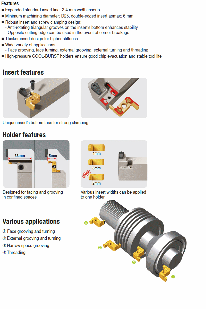 Application | | Ext. Grooving | Ext. Grooving & Turning | Face Grooving | Face Grooving & Turning | Face Grooving Along Shaft | Inserts | | Coating | TiAlN+TiN |